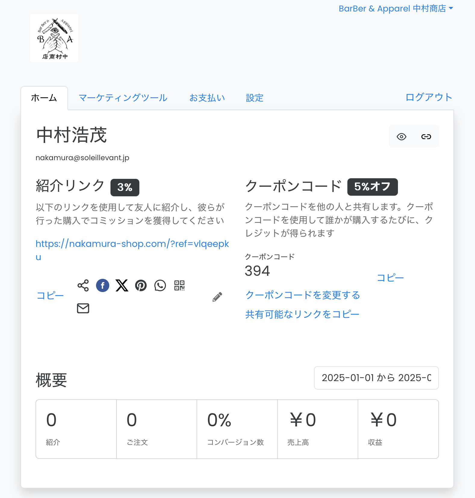 - ブログ記事やSNS投稿、YouTube動画などでリンクを貼って、BarBer & Apparel 中村商店の商品を紹介。