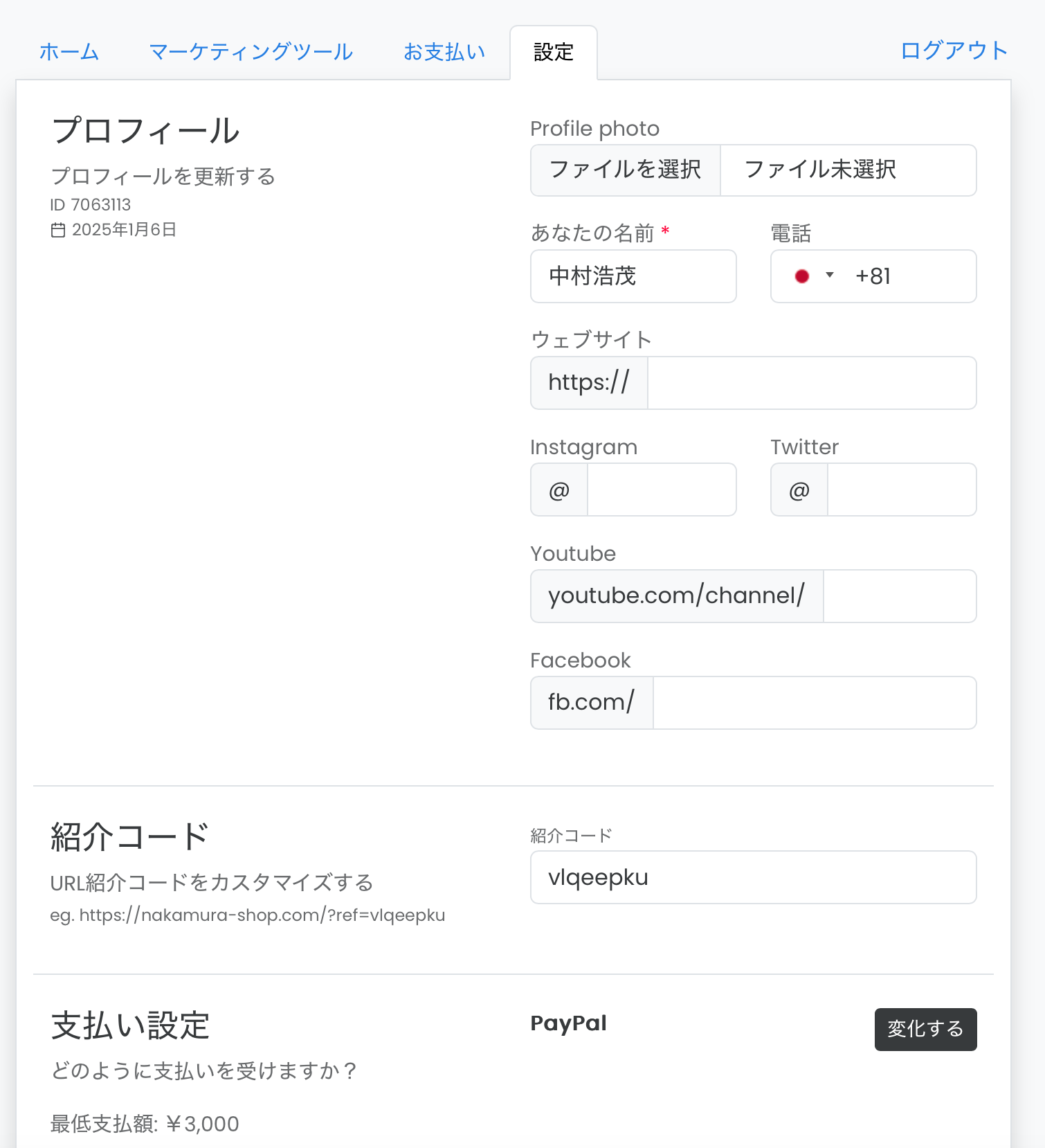 - ダッシュボードにログインしたら、プロフィール情報(SNSリンクや支払方法など)を設定。