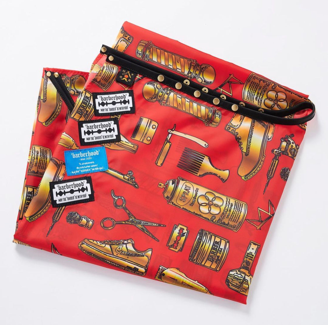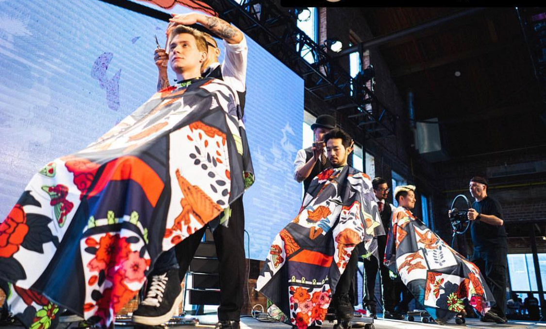 ローカルバーバーショップの方々と、アーティストBobさん、そしてBarber & apparel 中村商店のトリプルコラボレーションケープになる。